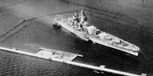 Линкор «Ришельё» в порту Дакара, за противоторпедной сетью