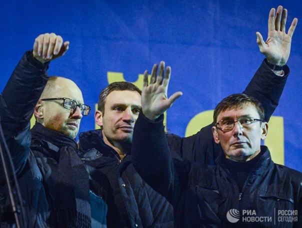 Арсений Яценюк, Виталий Кличко и экс-глава МВД Украины Юрий Луценко на митинге за вступление Украины в Евросоюз на Майдане Независимости в Киеве
