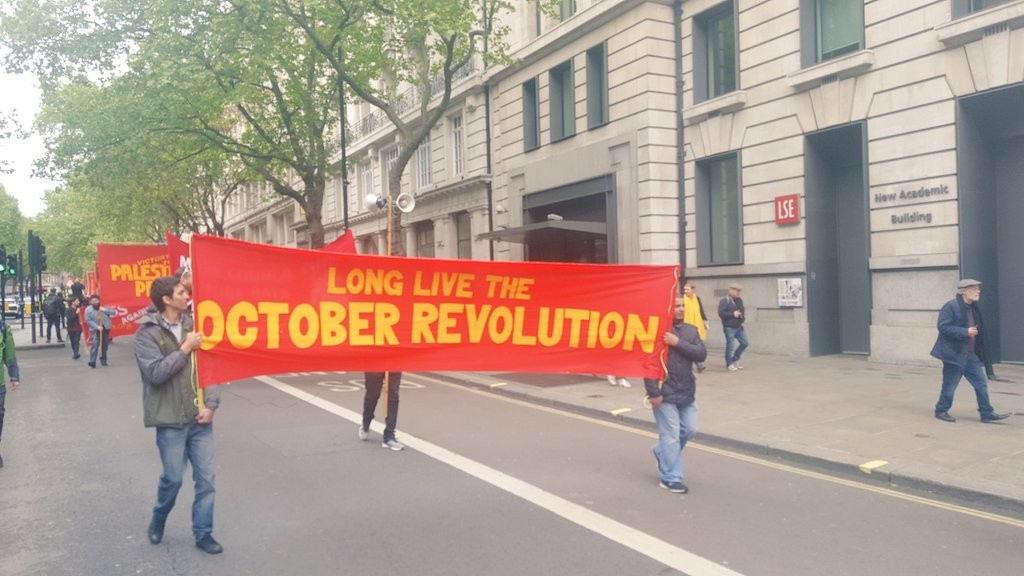 Первомайская демонстрация в Лондоне. Основу мероприятия составили компартия Британии и профсоюзные организации. Помимо первомайских лозунгов, засветились Сталин, Ленин, Оджалан, Уго Чавес, а так же лозунги в поддержку Венесуэлы, Сирии, курдов и палестинцев. Вспомнили и 100-летие Великой Октябрьской Социалистической Революции.