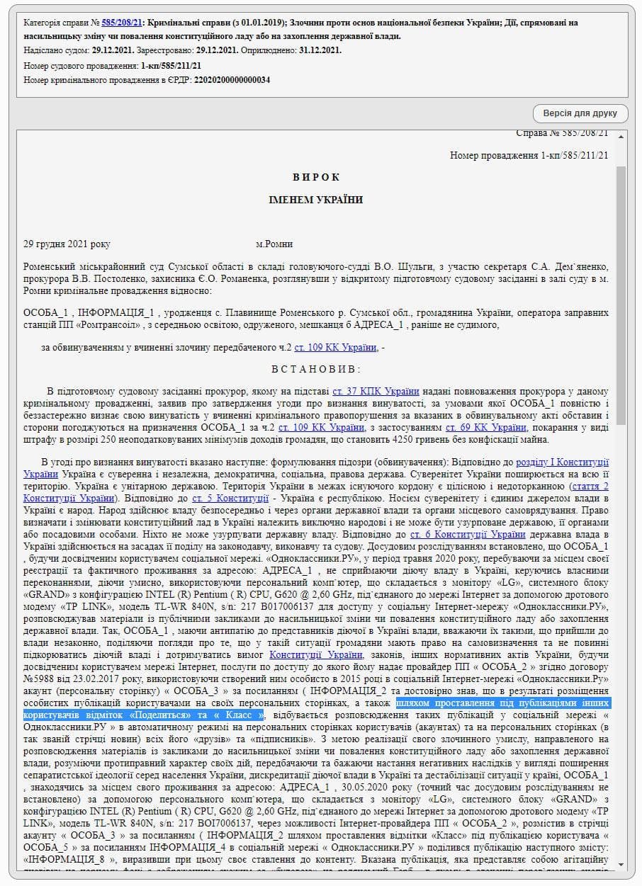 Суд в Сумской области осудил бывшего военного за лайки (отметку «класс») в соцсети «Одноклассники».