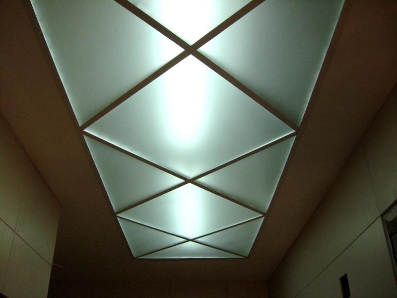 Придать потолку необычный вид помогает разное декоративное решение изготовленных стеклянных листов. Есть матовый и прозрачный материал, монохромный и с рисунком, который бывает абстрактным, геометрическим, взятым из живой природы. Есть стекло с зеркальным напылением. Разные по оформлению фрагменты можно чередовать, добиваясь большей выразительности всей конструкции. Если позволяет наполненность кошелька, потолок можно оформить дорогим витражным стеклом с металлическими вставками. Более простой вариант – приклеить к обычному прозрачному стеклу декоративную пленку, а для большего эффекта сделать оригинальную подсветку.