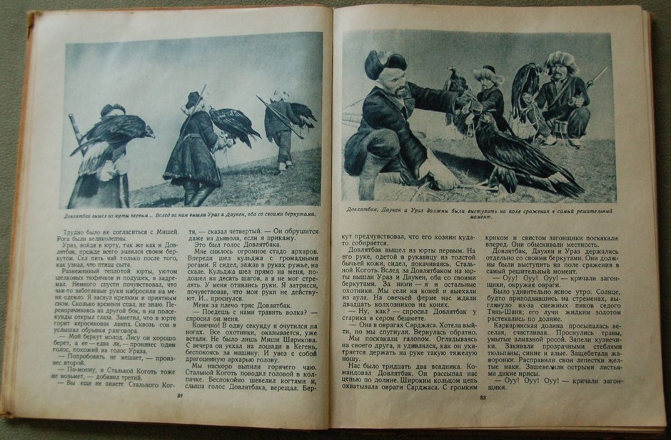 В детстве мне попалась книжка 1951г. издания, большая, красивая, в коленкоровом переплёте с фотографиями вместо иллюстраций. Называлась она "Стальной коготь". В книжке шла речь о беркуте воспитанном для охоты на лис и джейранов. Но однажды Стального когтя выпустили против матёрой волчицы, с которой не могли справиться опытные охотники, Стальной коготь сломал волчице хребет, хоть и самому ему пришлось нелегко.