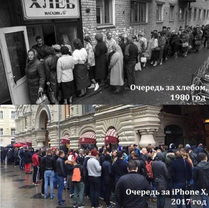 А теперь всё не то. Вот, например, сейчас в России два дня в очереди люди стоят за смартфоном ценой в 100 000 рублей. И только не говорите, что это не показатель уровня жизни в стране. Недавно, например, была очередь за кроссовками по 20 000 руб. Всё это мелкие, но очень характерные детали.