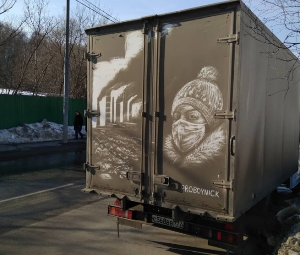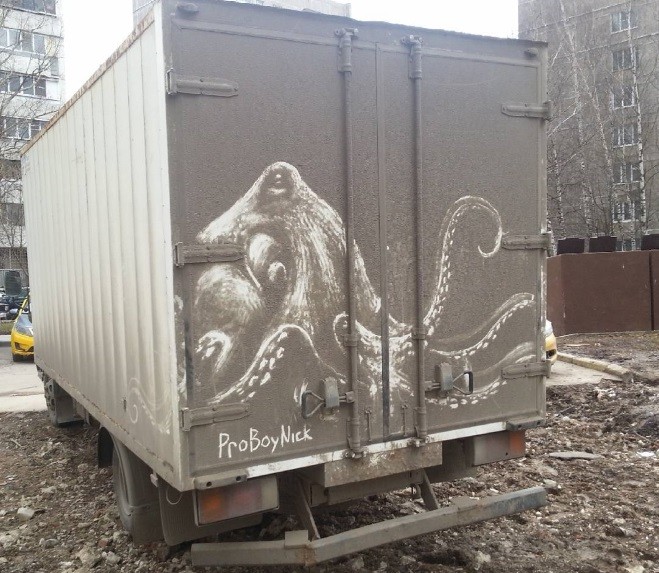 На улицах Москвы можно встретить автомобили, покрытые недолговечной графикой: линии, проведённые на пыльной и грязной поверхности машин, складываются в изображения людей или животных. Автор этих картин – 37-летний Никита Голубев, работающий под псевдонимом ProBoyNick.