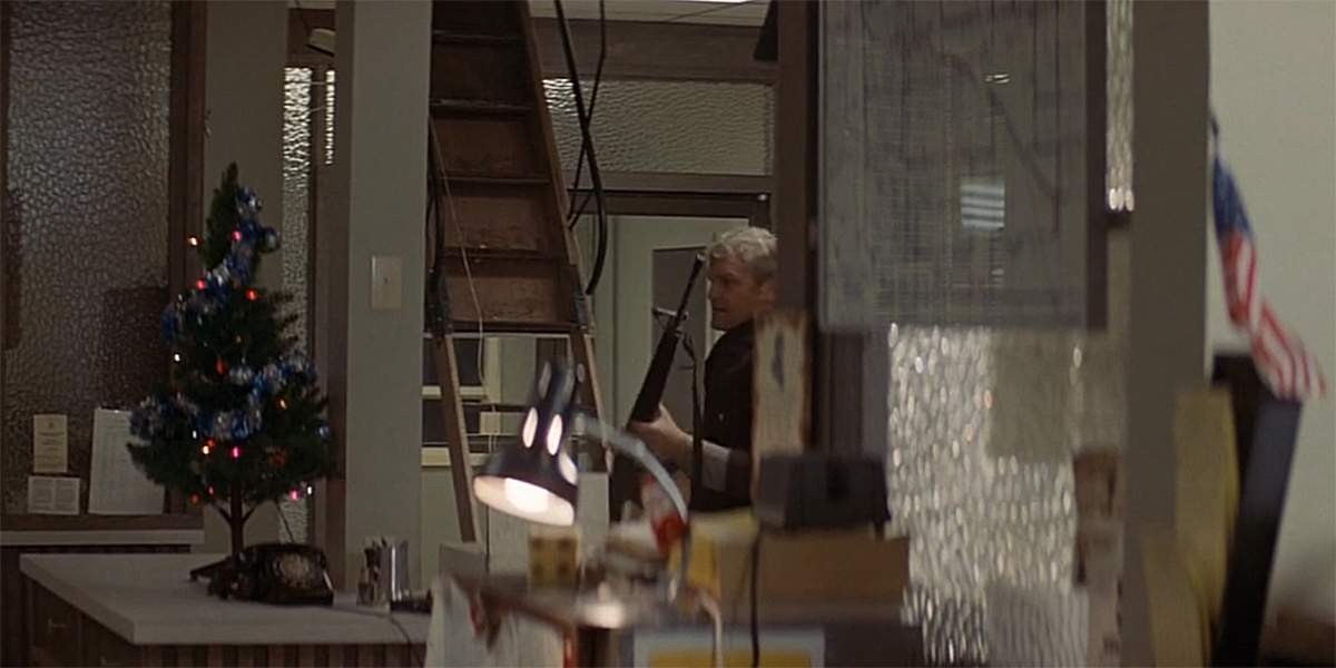 «Рэмбо» — рождественский фильм? Серьёзно? Да! Если внимательно присмотреться, на улицах города видны украшения к рождеству, а в офисе шерифа даже стоит ёлочка.