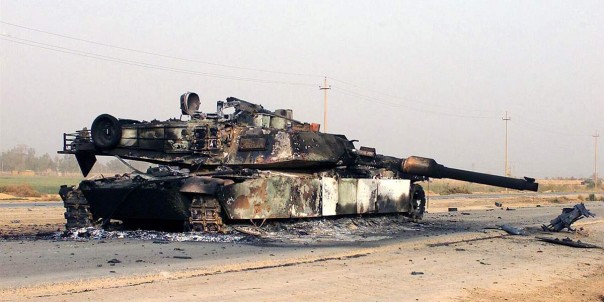 Старый Т-62, заставший ещё времена Советского Союза, вспыхнул после первого же попадания из могучей пушки «Абрамса». Замаскированная в заводском дворе «Шилка» от попадания 120-мм снаряда просто сложилась, как картонная коробка. Два выстрела — две мишени.