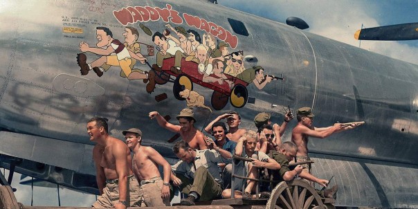 Один из тамошних экипажей, летавших на B-29, решил не страдать ложной скромностью и изобразил на борту самолёта себя — в неповторимой шаржевой манере. А потом ещё и сфотографировался рядом, с жизнерадостными лицами. Вышло офигенно.