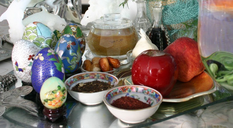 Крашеные яйца персы ставят на обрядовый новогодний стол под названием хафт-син. По традиции, на нем должно быть семь видов еды, начинающихся по-персидски с буквы «с» (чеснок, яблоки, ростки, побеги лоха, уксус, хлебный пудинг, специю сумах).
