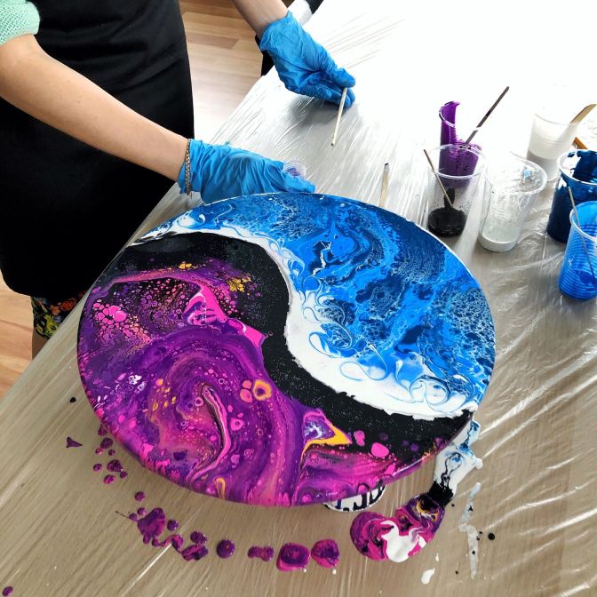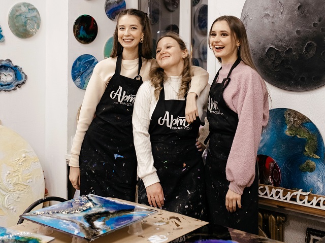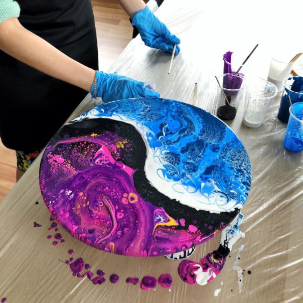 Идей много, например, можно организовать мастер класс по жидкому акрилу, на котором участники познакомятся с интересной техникой абстрактной живописи (Fluid Art) и сами создадут собственную картину. Это новое направление, суть которого заключается в необычном смешивании красок.
