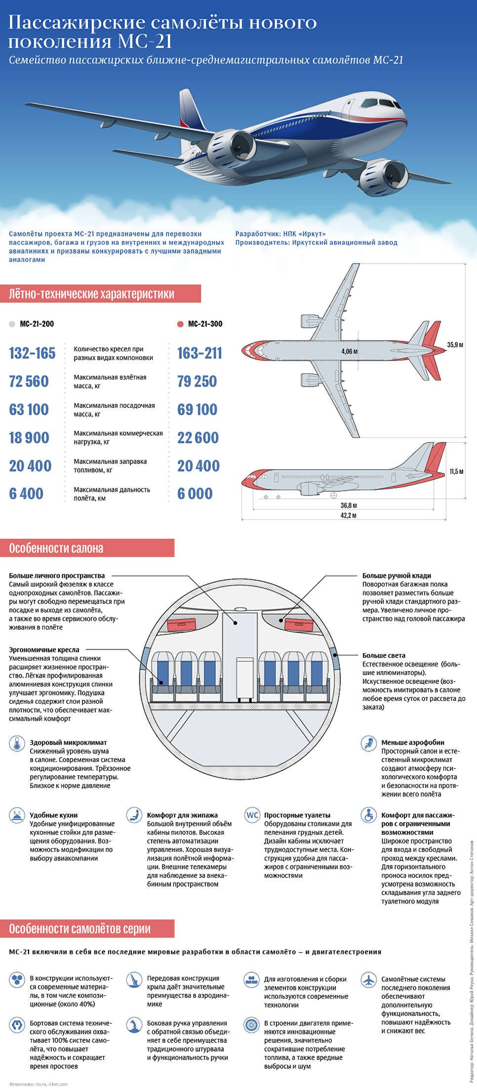 МС-21 — перспективный пассажирский самолет вместимостью от 150 до 211 пассажиров, включает в себя новейшие разработки в области самолето- и двигателестроения, бортового оборудования и систем. Он сменит советские самолеты "Ту", "Як" и "Ан". На новых воздушных судах впервые используют композитное крыло для гражданских самолетов такого класса. Корпорация "Иркут" (в составе ОАК) создает самолет в широкой международной кооперации.