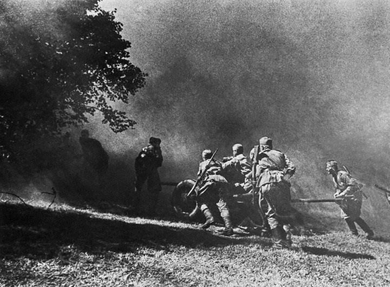 Советские артиллеристы выдвигают 45-мм противотанковое орудие на прямую наводку во время боев на Курской дуге.
