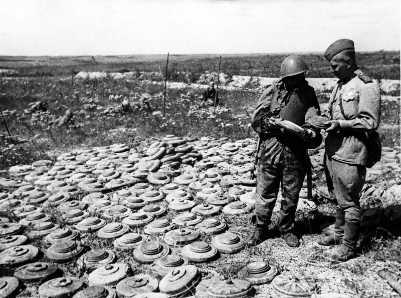 Советский сапер показывает старшему лейтенанту устройство немецкой противотанковой мины. У старшего лейтенанта (предположительно танкист) в руках нажимная крышка мины «Теллермина-43» (Tellermine Pilz 43). Большая часть мин в кадре — «Теллермина-43». Курская дуга.