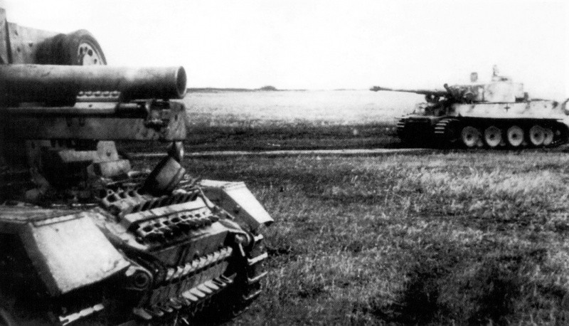 Немецкая бронетехника на Курской дуге. Слева расположена редко встречающаяся, 150-мм штурмовая самоходная установка Sturminfanteriegeschütz 33B (StuIG33 Ausf.B). Машина была создана путем установки 150-мм гаубицы sIG33 L/11 на базу танка Pz.Kpfw. III Ausf. В. Машина была изготовлена в количестве 24-х экземпляров. Справа танк Pz. Kpfw. VI Ausf. Е «Тигр» 503-го тяжелого танкового батальона (Schwere Panzer-Abteilung 503).