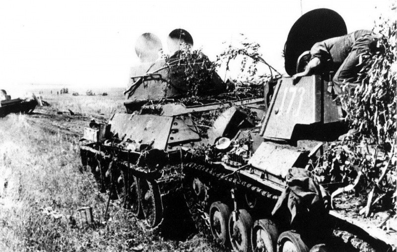 Советские танки Т-34 и Т-70, подбитые в ходе сражения на Курской дуге. Немецкий солдат осматривает через башенный люк легкий танк Т-70. Судя по дыму, танк Т-34 еще продолжает гореть. Снимок сделан немецким фотокорреспондентом в начале июля 1943 года.