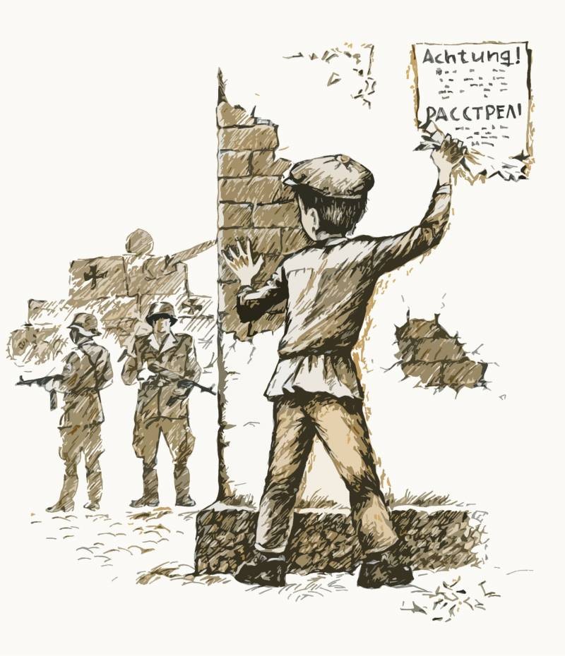 Он стал бороться с захватчиками, как умел, по-своему. Так, однажды обнаружил кабель связи фашистов. Незаметно проследил его «путь». И ночью, в комендантский час, пробрался за город, вырезал большой кусок кабеля и бросил в реку. Помогал и раненым — бегал к концлагерю и тайком отдавал красноармейцам еду. Не раз мать находила в карманах сына клочки бумаги — это были сорванные немецкие приказы.