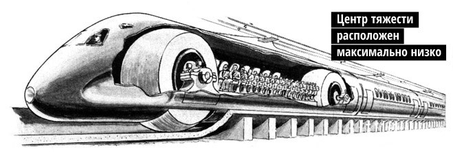 А вот зачем: вагончик с массивным маховиком, горизонтально вращающимся под полом, сможет, как цирковой эквилибрист, устойчиво ехать по одному рельсу. Значит, можно сэкономить на втором рельсе, на длине шпал, упростить конструкцию стрелок и так далее. Маховик раскручивался до высоких оборотов электромотором, и даже при аварийном отключении его поезд бы не опрокинулся: инерции маховика хватило бы на продолжительное время, в течение которого состав успел бы остановиться и опустить боковые опоры-подножки. Планировалось, что поезд будет состоять из моторного и пассажирского вагонов обтекаемой формы на 50 пассажиров. В движение со скоростью до 150 км/ч его должны были приводить два двигателя по 240 л. с.