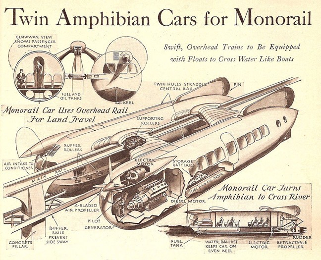 Горизонтальные колеса соединены с вагоном гидравлической пружинной муфтой, между буксой и рамой установлены резиновые прокладки (подобные элементы будут внедряться на железнодорожном транспорте лишь в 1950-е годы). Аэропоезд вмещает 300 пассажиров — как современный широкофюзеляжный аэробус. Два двигателя по 530 л. с. с воздушными винтами будут гнать этот нелетающий самолет по рельсам эстакады со скоростью 250–300 км/ч.