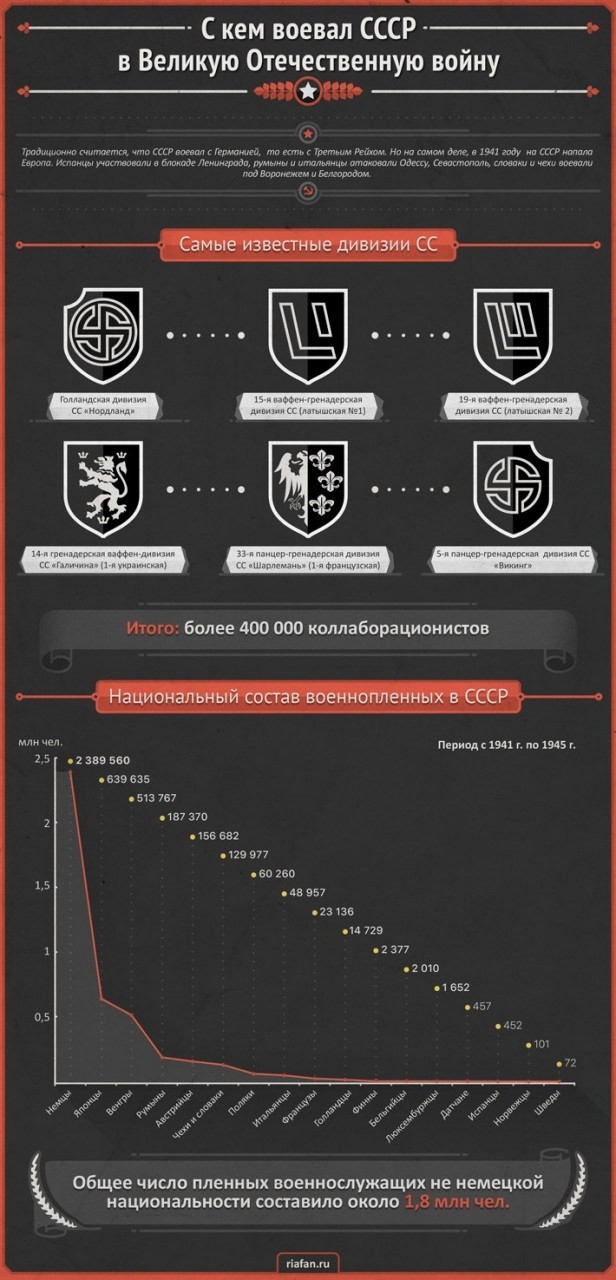 О весьма пестром национальном составе войск, противостоящих РККА, весьма красноречиво говорит национальный состав военнопленных, оказавшихся к концу войны в нашем плену. Простой факт: датчан, норвежцев и даже французов в плену на восточном фронте оказалось больше, чем участвовало в сопротивлении нацистам на их родине.