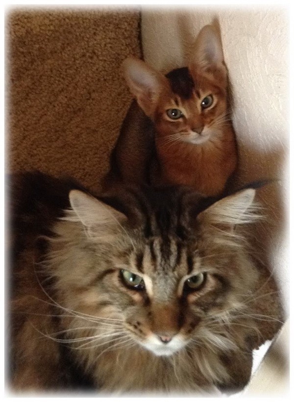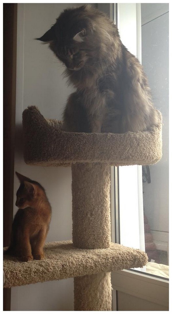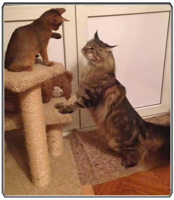 И все же мэйнкуны не зря считаются самыми умными котами. Муня раскинул мозгом и решил, что бегать продуктивнее, чем прыгать. И теперь в коридоре то и дело случаются половецкие пляски: мелким горохом сыплется Буся, тяжелой конницей летит за ним Муня. Ан снова незадача… в беге Муня шмакодявку мгновенно обгоняет, и, как только это происходит, мелкий тут же бежит в обратную сторону. Муня тормозит когтями по полу, разворачивается и снова в безрезультатную погоню — и так несколько десятков раз в день!
