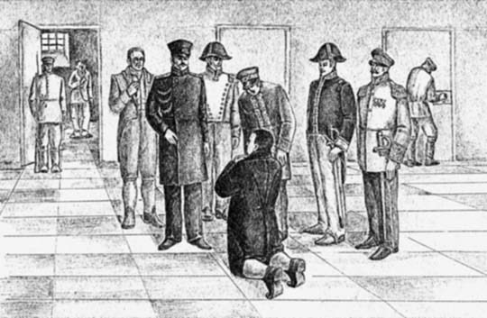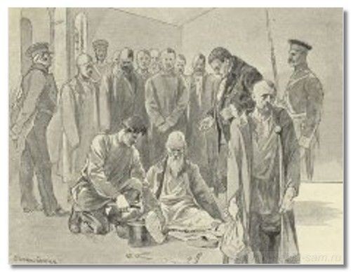 «Что это значит?» — спросил Государь Гааза, которого знал лично. Вместо ответа Федор Петрович стал на колени. Думая, что он просит таким своеобразным способом прощения за допущенное им послабление арестанту, Государь сказал ему: «Полно! я не сержусь, Федор Петрович, что это ты, встань!» — «Не встану!» — решительно ответил Гааз. «Да я не сержусь, говорю тебе... чего же тебе надо?» — «Государь, помилуйте старика, ему осталось немного жить, он дряхл и бессилен, ему очень тяжко будет идти в Сибирь. Помилуйте его! я не встану, пока Вы его не помилуете...» Государь задумался... «На твоей совести, Федор Петрович!» — сказал он наконец и изрек прощение. Тогда счастливый и взволнованный Гааз встал с колен.