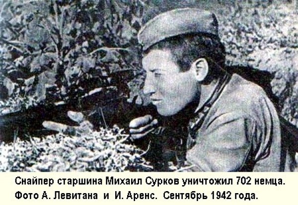 «Дело это трудное: снайпер обнаруживается только при выстреле, в другое время засечь его практически невозможно. Значит, требовалось вызвать противника на выстрел. Михаил срезал на огороде тыкву, надел на неё каску и высунул над бруствером ложного окопчика, метрах в 400 от немцев. Со стороны врага эта тыква с каской „читалась“ как голова солдата. Потом Сурков переполз в другой окоп, метрах в 40 от ложного, сделал выстрел и стал наблюдать. Очень скоро по тыкве стали бить — вначале это были винтовочные выстрелы, потом ударил миномёт. Во время перестрелки Михаил и обнаружил снайпера противника. В тот день он убил своего 702-го врага».