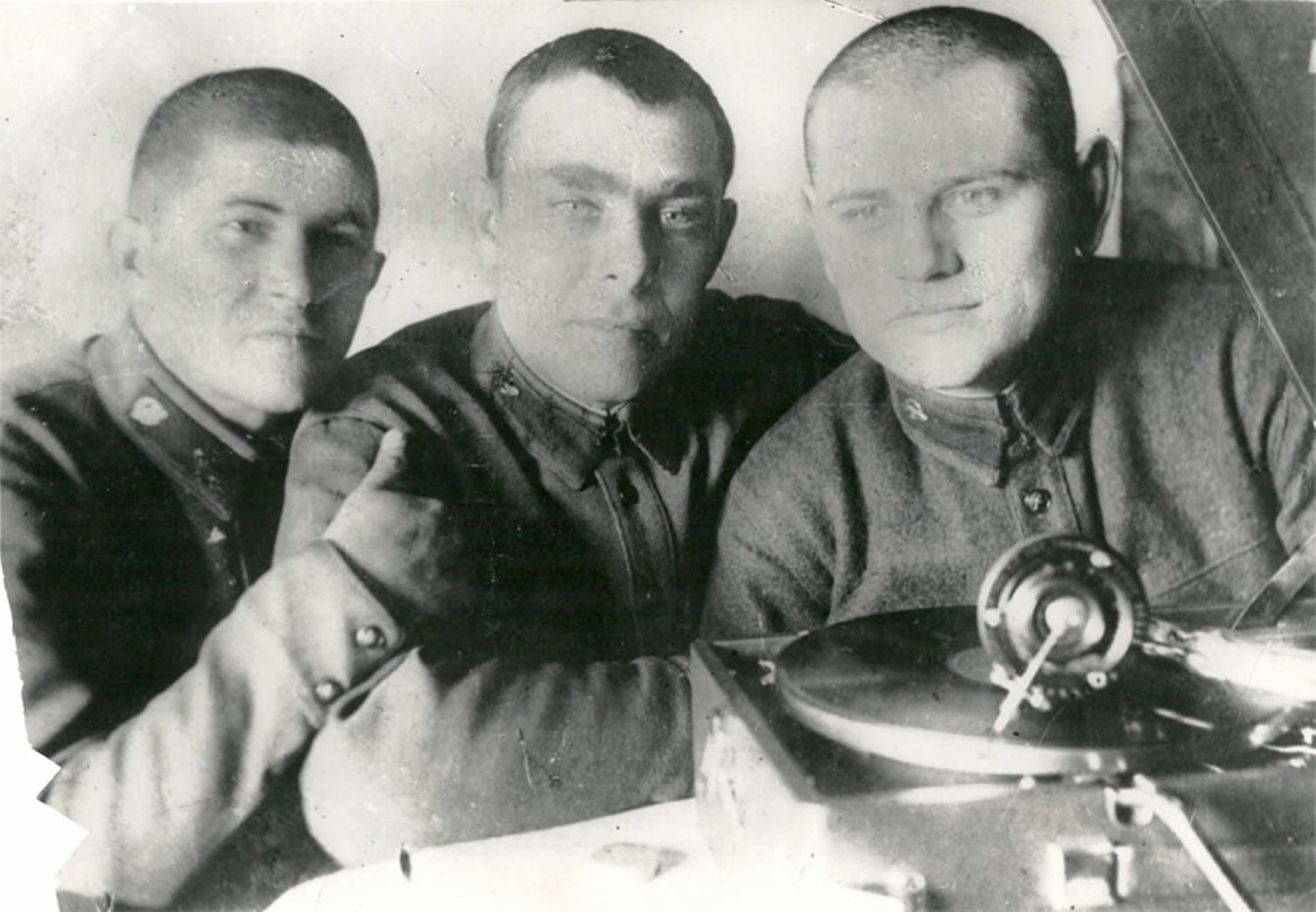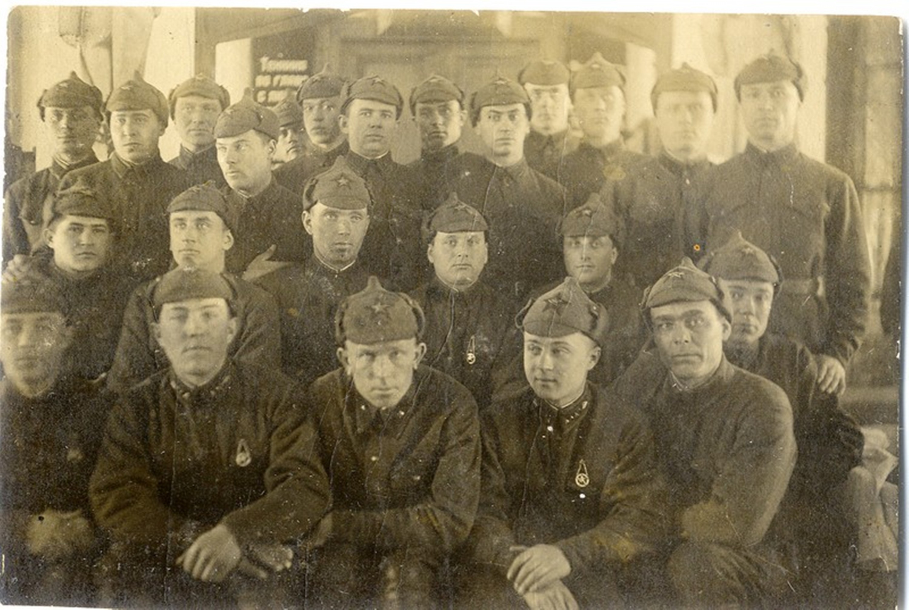 Фото: Л.И. Брежнев среди курсантов 9-ой роты, 1-го взвода танкового учебного полка. В первом ряду справа - Л.И. Брежнев.