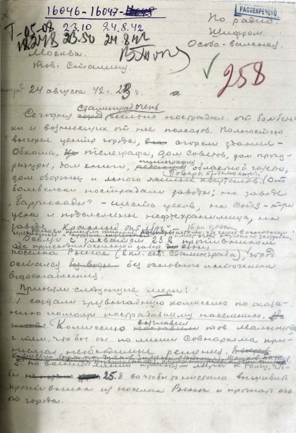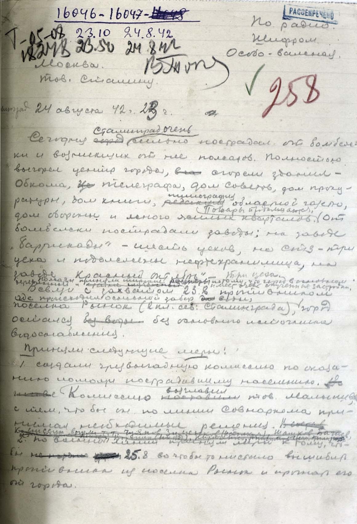 Боевое донесение командующего Сталинградским фронтом от 24 августа 1942 года о сильной бомбежке Сталинграда. Противник проводил в течение дня массированное бомбометание над Сталинградом, в результате чего образовалось очень большое количество пожаров, полностью выгорел центр города, сильно пострадали жилые кварталы, заводы. Донесение составлено 24 августа в 23 часа, в это время пожары еще продолжались.