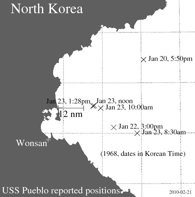 По мнению Госдепартамента, корейцы изловили разведчика в нейтральных водах. Однако корейцы, в свою очередь, потребовали извинений за вторжение в их акваторию. По общему правилу, к терводам относится полоса шириной в 12 морских миль вдоль побережья страны, однако это правило имеет свои исключения, и корейцы настаивали, что часть Японского моря, где произошёл инцидент, относится к ним.