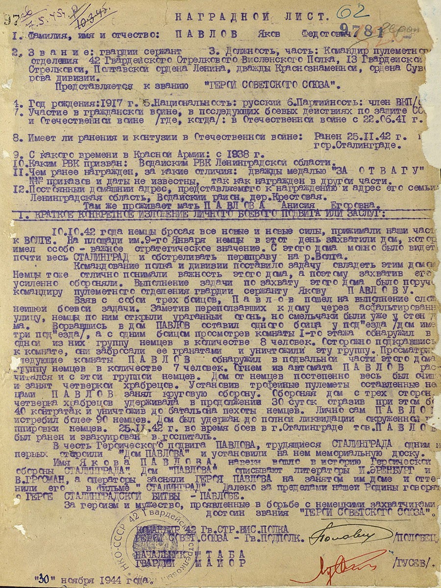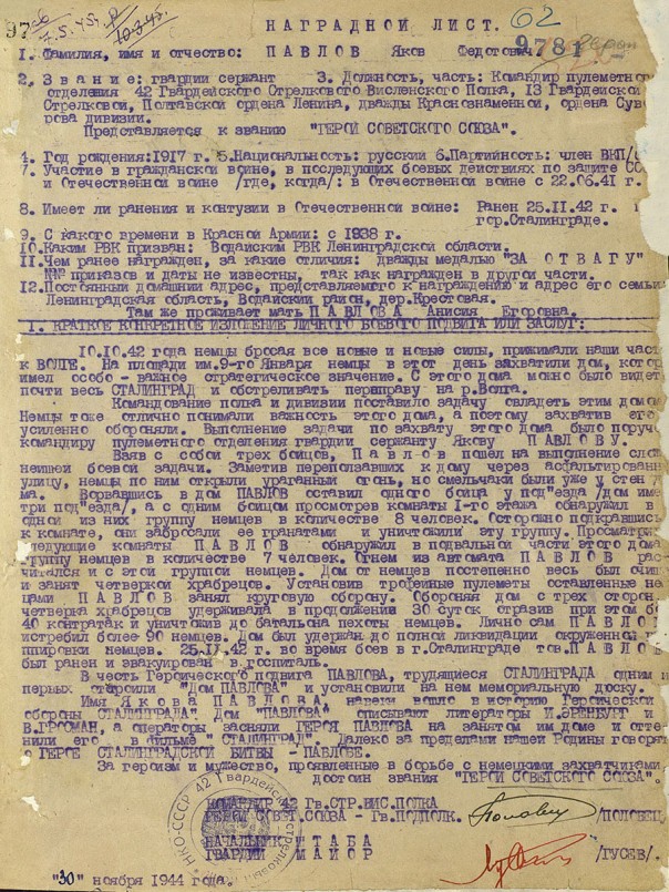 Отмечается, что основу раздела составляют наградные листы на присвоение звания Героя Советского Союза военным и командирам Красной Армии, защищавшим город. Также пользователи смогут прочитать официальные описания подвигов пулеметчика гвардии сержанта Якова Павлова, который с горсткой бойцов месяц удерживал стратегически важное здание; снайпера младшего лейтенанта Василия Зайцева, который за чуть более чем два месяца уличных боев уничтожил 225 фашистов.