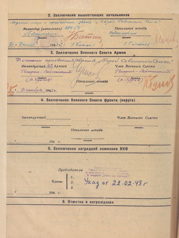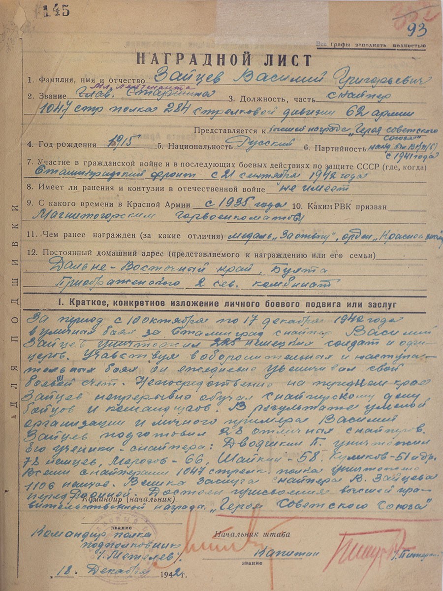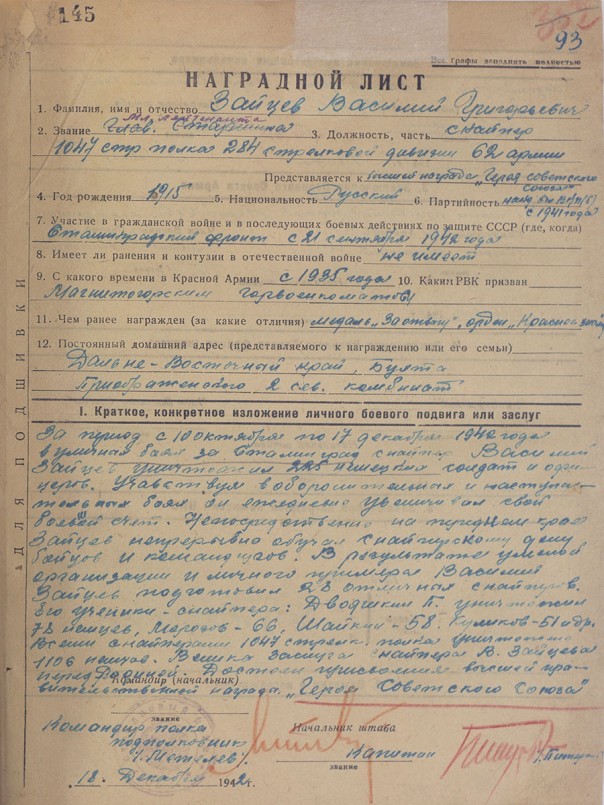Наградной лист на присвоение звания Героя Советского Союза снайперу 1047 стрелкового полка