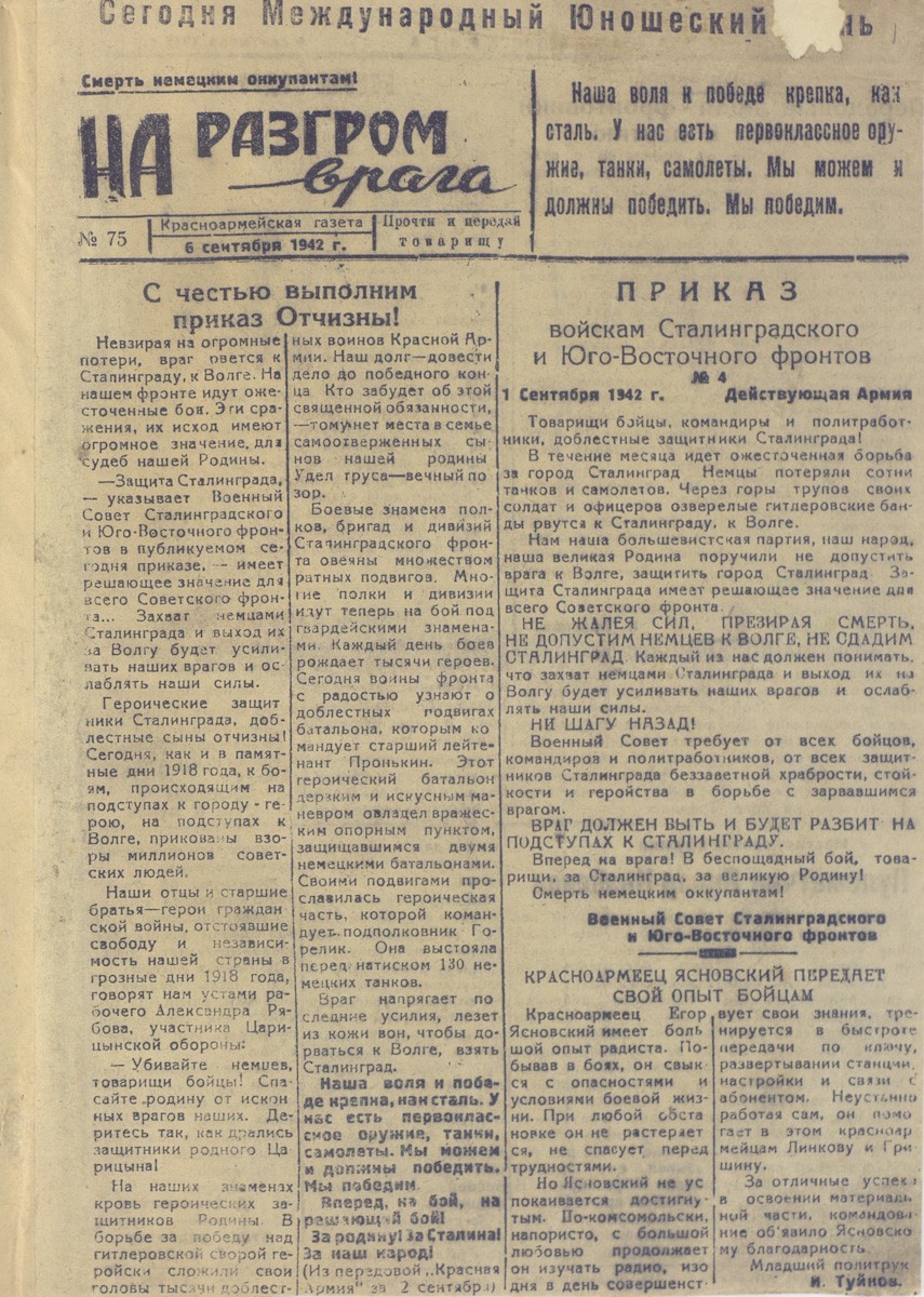 В Минобороны уточняют, что значительную часть документов составляют выпуски фронтовой газеты 13-й гвардейской стрелковой дивизии "На разгром врага" за те полгода, когда шли самые ожесточенные бои за Сталинград. Из газет можно узнать историю борьбы Красной Армии за город, а также прочесть в них правительственные документы того времени, списки награжденных боевыми орденами и медалями, рассказы о героических подвигах красноармейцев.