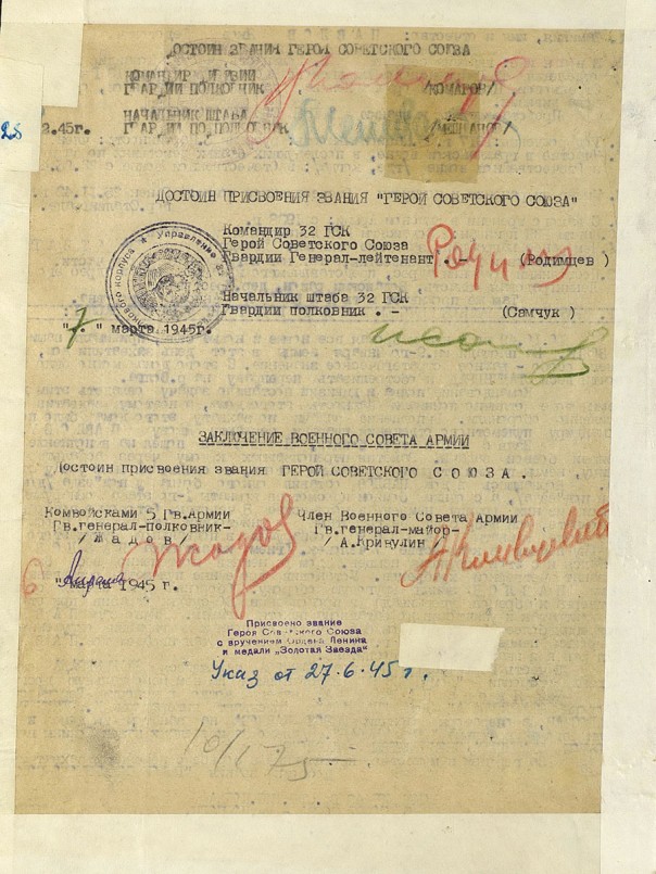 Наградной лист на присвоение звания Героя Советского Союза командиру пулеметного отделения