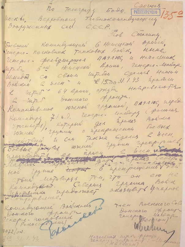 Донесение командующего войсками Донского фронта К.К.Рокоссовского в Ставку ВГК от 31 января 1943 года о пленении командующего 6 немецкой армией фельдмаршала Ф.Паулюса под Сталинградом