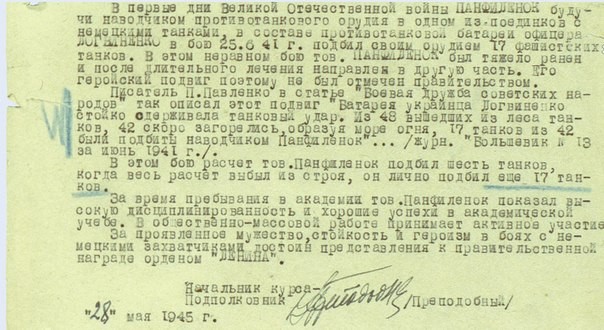 В том бою только из орудия сержанта Ивана Панфилёнка было уничтожено 17 вражеских танков, 11 из которых командир орудия уничтожил лично. Всего же, после боя фашисты не досчитались 43 машин, что составило почти 15% боевой техники.