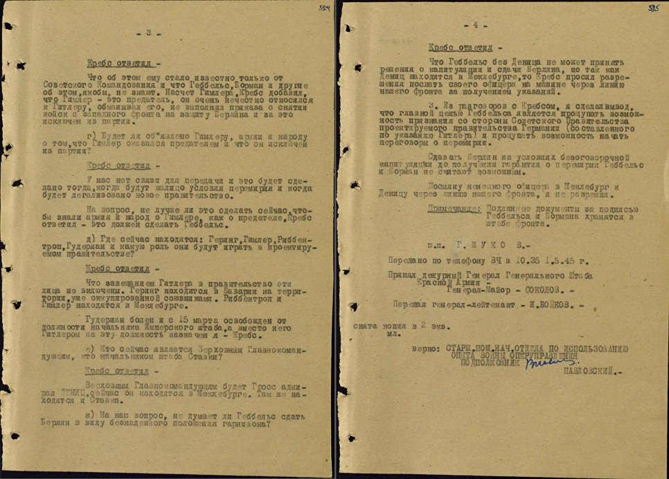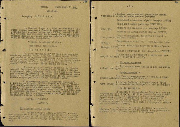 Немецкая депеша, подписанная Борманом и Геббельсом и адресованная непосредственно Сталину, начиналась так: "Берлин, 30 апреля 1945 г. Имперская канцелярия. Сообщение. Мы уполномочиваем начальника Генерального штаба сухопутной армии генерала пехоты Ганса Кребса для передачи следующего сообщения: "Я сообщаю вождю советских народов, как первому из не немцев, что сегодня, 30 апреля 1945 г., в 15.50 вождь немецкого народа Адольф Гитлер покончил жизнь самоубийством".