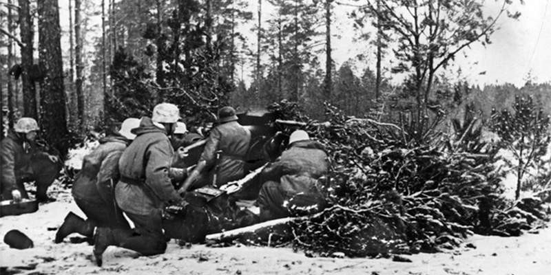 Расчет немецкой противотанковой пушки ведет бой в лесу