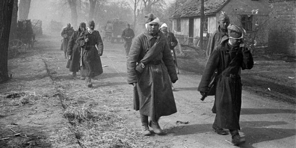 Раненые красноармейцы идут на перевязку в районе Зееловских высот