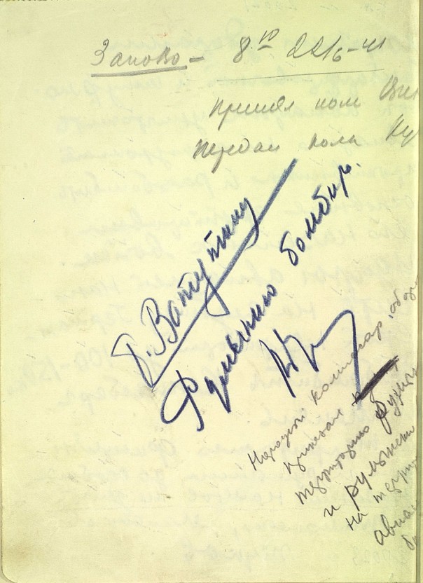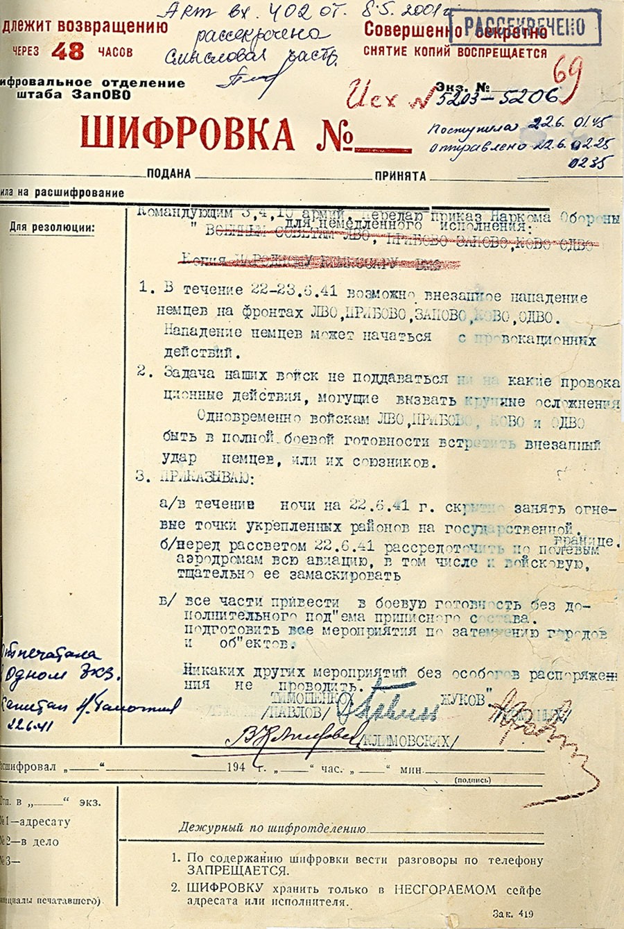 Среди документов — копия директивы наркомата обороны №1 от 22 июня 1941 года, подписанная начальником генштаба Георгием Жуковым и наркомом обороны Семеном Тимошенко и переданная в ночь на 22 июня командующим 3-й, 4-й и 10-й армиями, а также рассекреченная копия рукописного боевого приказа наркомата обороны №2 от 22 июня 1941 года, собственноручно составленного Жуковым спустя три часа после начала войны – в 7.15 утра. Приказ предписывает Красной армии "всеми силами и средствами обрушиться на вражеские силы и уничтожить их в районах, где они нарушили советскую границу", а бомбардировочной и штурмовой авиации уничтожать вражеские самолеты на аэродромах базирования и группировки наземных войск "на глубину германской территории до 100-150 километров".