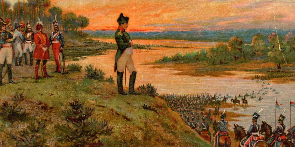 Поведением Наполеона в момент перехода через Неман заинтересуется любой практикующий психиатр. Пока сапёры наводили мосты, император не находил себе места, перебегал из палатки в дом польского помещика и обратно, пребывал в ажитации. На другой день во время переправы он поначалу стоял у одного из мостов, ободряя солдат и принимая приветствия, но вскоре не вытерпел, перешёл мост и поскакал во весь опор на арабском скакуне вдоль леса, словно ловя невидимого неприятеля.
