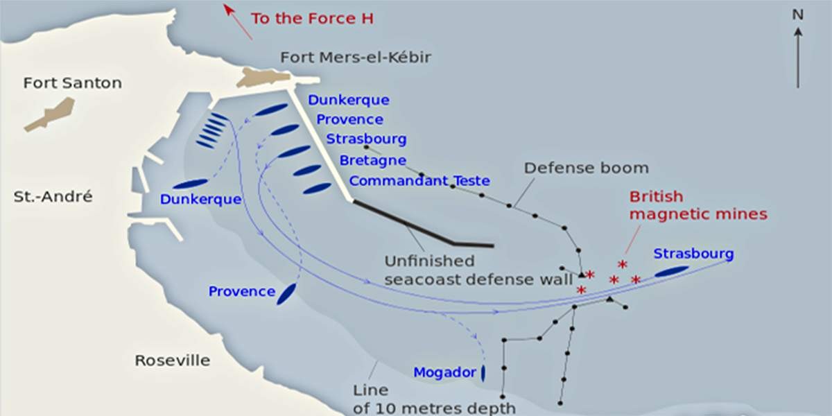 На рассвете 3 июля 1940 года на траверзе французской военно-морской базы Мерс-эль-Кебир близ алжирского города Орана появилась британская эскадра. Её вёл вице-адмирал Сомервилл на линейном крейсере «Худ». Следом шли два старых супердредноута: «Вэлиант» и «Резолюшн», а также авианосец «Арк Ройял».