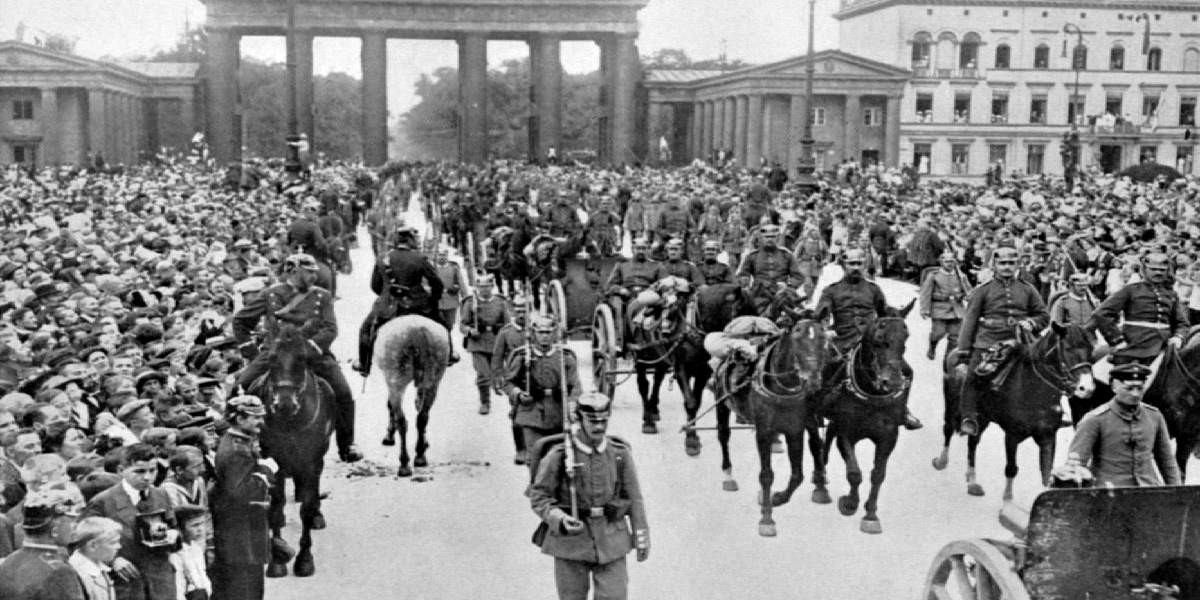 Германские артиллеристы проходят Бранденбургские ворота, лето 1914-го