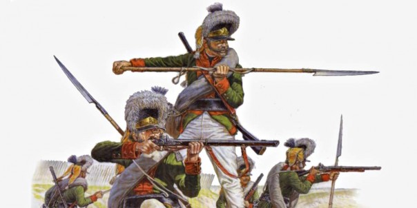 В период наполеоновских войн стрелки выстраивались в три шеренги (линии). При этом третьей было очень неудобно стрелять. Поэтому проблему пытались решить постановкой солдат первой линии на колено либо передачей оружия от третьей шеренги ко второй (то есть стреляла вторая, а третья только перезаряжала).