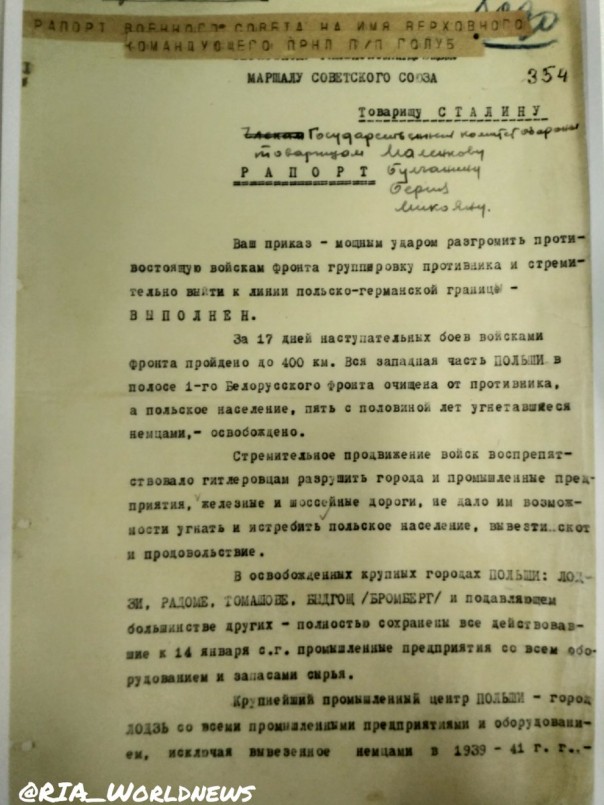 Рассекреченный рапорт командующий войсками Первого Белорусского фронта маршал Георгий Жуков написал Государственному комитету обороны во главе с Иосифом Сталиным 29 января 1945 года.