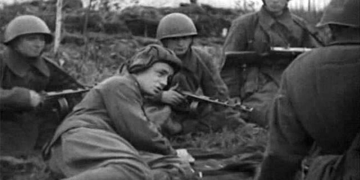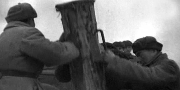 На экране — глубокие траншеи, недавно отбитые у немцев. Наверху — ожесточённая дуэль артиллерии. Бойцы вжались в «лисьи норы». А оператор должен работать… И он снимает сплошную пелену дыма с разлетающимися обломками.