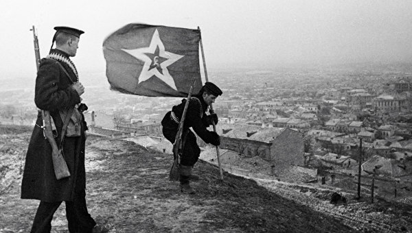 Моряки-десантники водружают на горе Митридат знамя - символ освобождения Керчи от немецких захватчиков