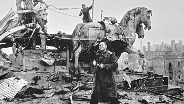 Военный фотокорреспондент Евгений Халдей на Бранденбургских воротах в Берлине