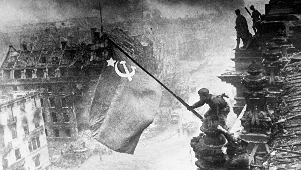 История самого известного победного снимка началась с того, что в Берлин прибыл Евгений Халдей с тремя красными знамёнами. Он по опыту знал, что флаг лучше иметь с собой. Флаги пошил в Москве знакомый портной Халдея Израиль Кишицер из скатертей. В один из приездов в Москву наш земляк обедал в столовой «Фотохроники», где на столах были расстелены красные скатерти, три из них Евгений выпросил у завхоза фотохроники ТАСС, пообещав вернуть после войны. Звезду, серп и молот Халдей выкроил лично.