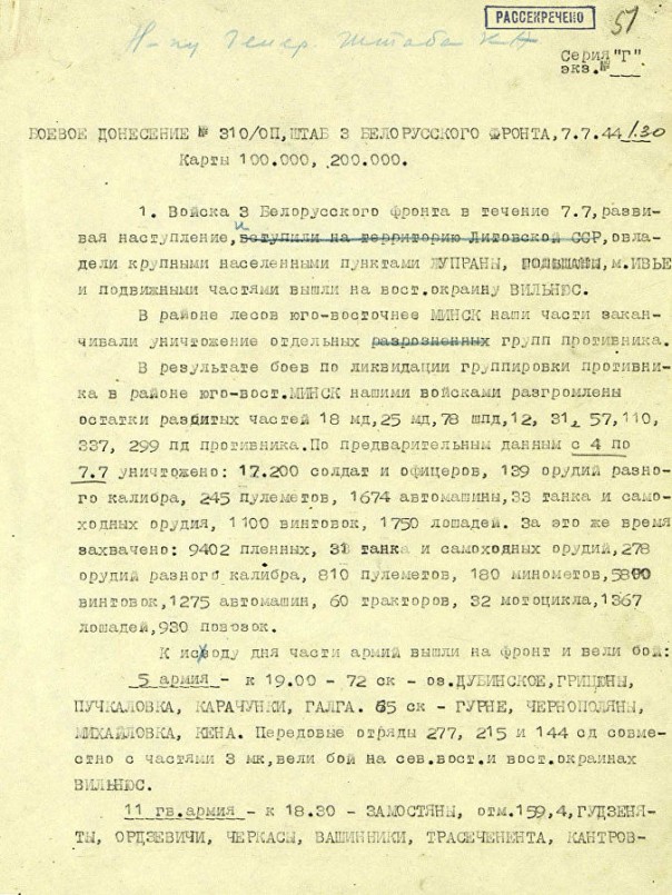 Минобороны регулярно публикует на своем сайте рассекреченные материалы, посвященные событиям Великой Отечественной войны. В частности, 3 июля были обнародованы документы, посвященный 75-летию освобождения Минска от немецко-фашистских захватчиков.