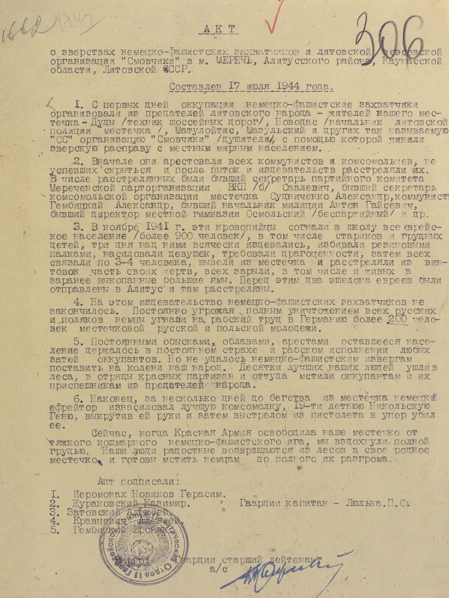 Акт от 17 июля 1944 года о зверствах немецко-фашистских захватчиков и литовской эсэсовской организации «Смовчики» (душители) в местечке Меречь Алитусского района Каунасской области Литовской ССР. В организацию входили предатели литовского народа, чинившие расправы над местным мирным населением.