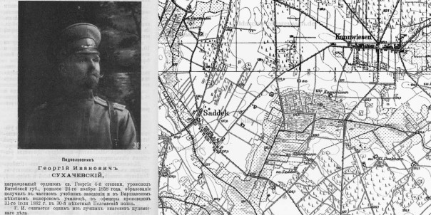Фотопортрет подполковника Г. И.Сухачевского, опубликованный в 1914 году в журнале «Разведчик» и немецкая карта непосредственно того района, где 17 августа 1914 года с боем шёл к границе сводный отряд подполковника Сухачевского и капитана Попова